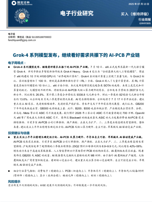 【国金证券】【20250713】电子行业研究:Grok-4系列模型发布,继续看好需求共振下的AI-PCB产业链-10页 行业研究