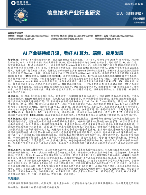【国金证券】【20250112】信息技术产业行业研究:AI产业链持续升温,看好AI算力、端侧、应用发展-17页 行业研究