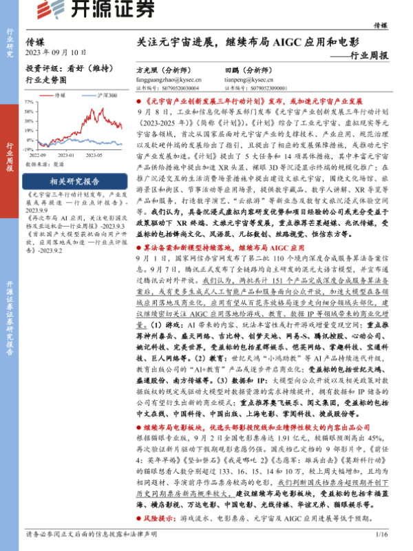 【开源证券】【20230910】传媒行业周报:关注元宇宙进展,继续布局AIGC应用和电影-16页 行业研究