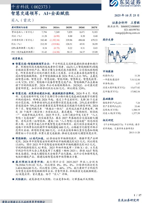 【东吴证券】【202510】千方科技(002373):智慧交通领军,AI+全面赋能-17页 证券期货研究报告