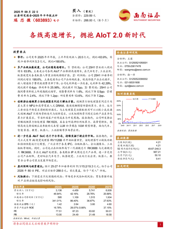 【西南证券】【202509】瑞芯微(603893)2025年半年报点评:各线高速增长,拥抱AIoT+2.0新时代-11页 证券期货研究报告
