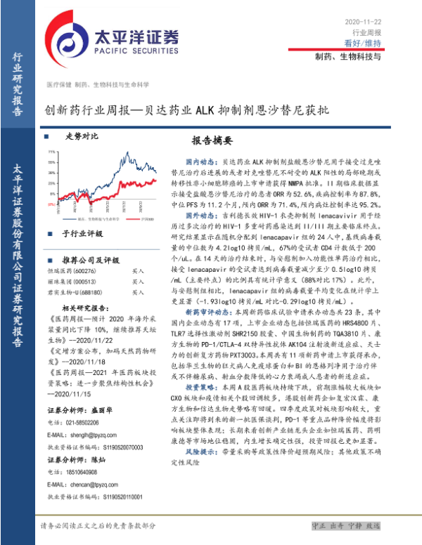 【太平洋证券】【20201122】创新药行业周报:贝达药业ALK抑制剂恩沙替尼获批-12页 行业研究