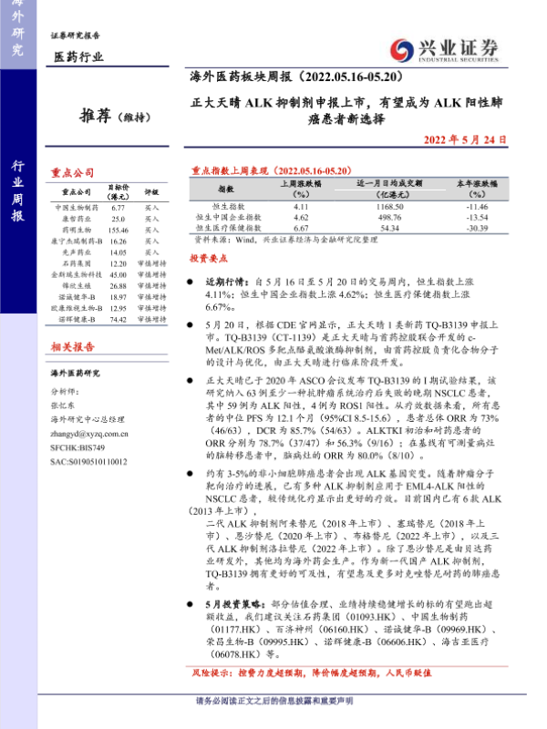 【兴业证券】【20220524】海外医药板块周报:正大天晴ALK抑制剂申报上市,有望成为ALK阳性肺癌患者新选择-21页 行业研究