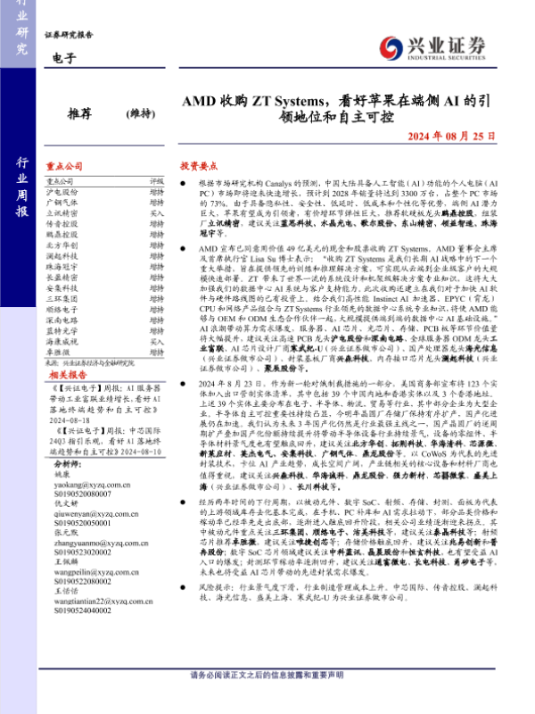【兴业证券】【20240825】AMD收购 ZT Systems,看好苹果在端侧 AI的引领地位和自主可控-10页 行业研究