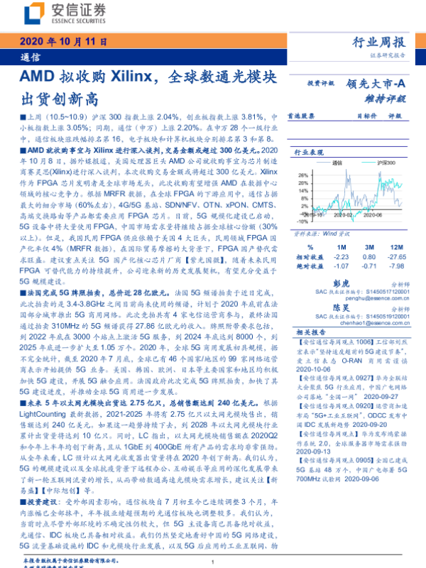 【安信证券】【20201011】通信行业周报:AMD拟收购Xilinx,全球数通光模块出货创新高-14页 行业研究