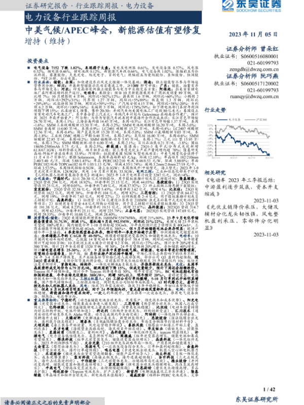 【东吴证券】【20231105】电力设备行业跟踪周报:中美气候 APEC峰会,新能源估值有望修复-42页 行业研究