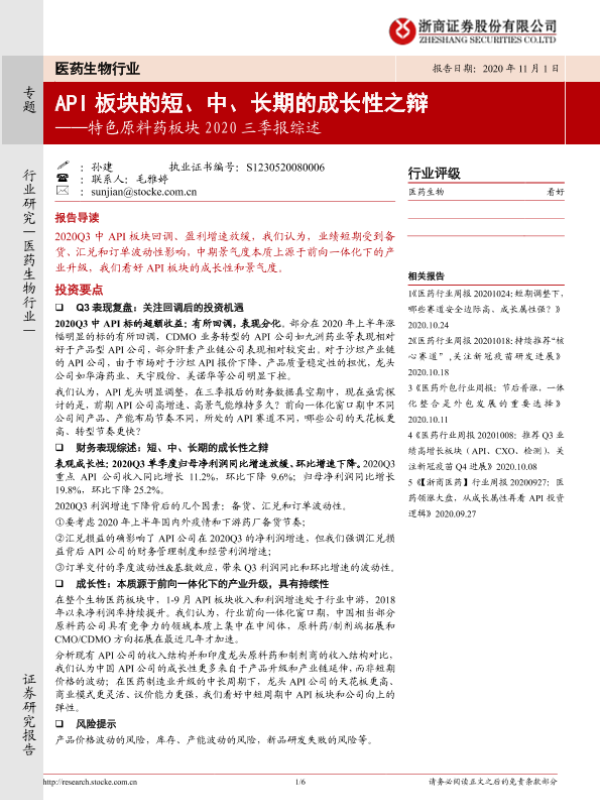 【浙商证券】【20201101】特色原料药板块2020三季报综述:API板块的短、中、长期的成长性之辩-6页 行业研究