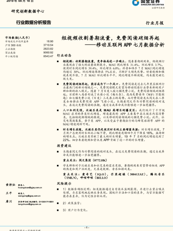 【国金证券】【20190818】移动互联网APP七月数据分析:短视频收割暑期流量,免费阅读硝烟再起-15页 行业研究