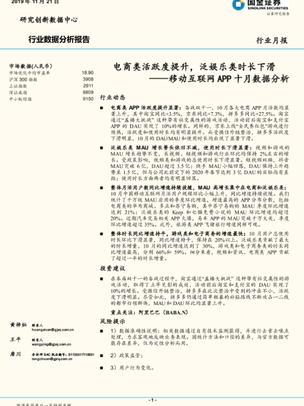 【国金证券】【20191121】移动互联网APP十月数据分析:电商类活跃度提升,泛娱乐类时长下滑-16页 行业研究