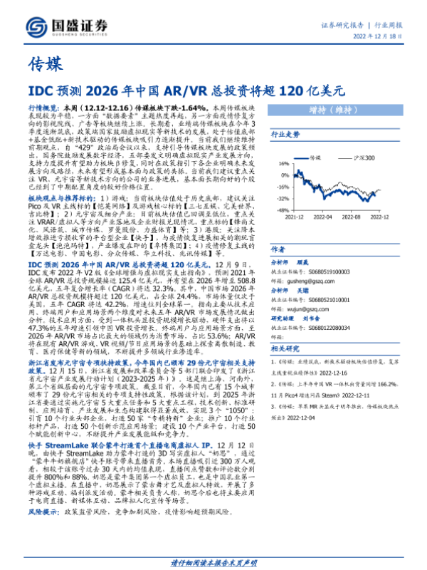 【国盛证券】【20221218】IDC预测2026年中国AR VR总投资将超120亿美元-10页 行业研究