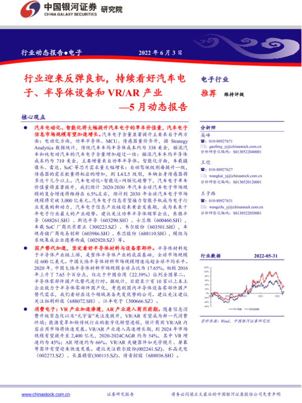 【银河证券】【20220603】电子行业5月动态报告:行业迎来反弹良机,持续看好汽车电子、半导体设备和VRAR产业-31页 行业研究