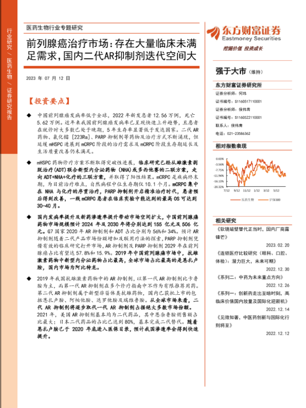 【东方财富证券】【20230712】医药生物行业专题研究-前列腺癌治疗市场-存在大量临床未满足需求-国内二代AR抑制剂迭代空间大-26页 行业研究