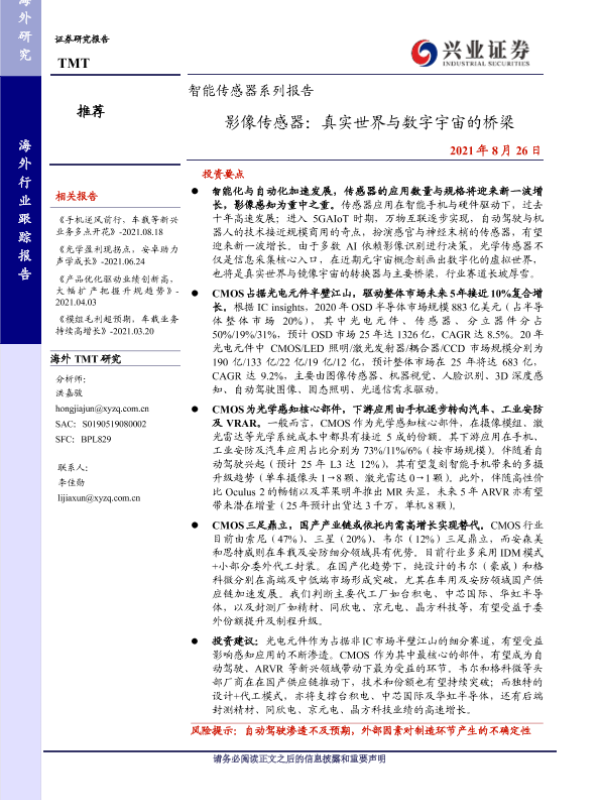 【兴业证券】【20210826】智能传感器系列报告:影像传感器:真实世界与数字宇宙的桥梁-12页 行业研究