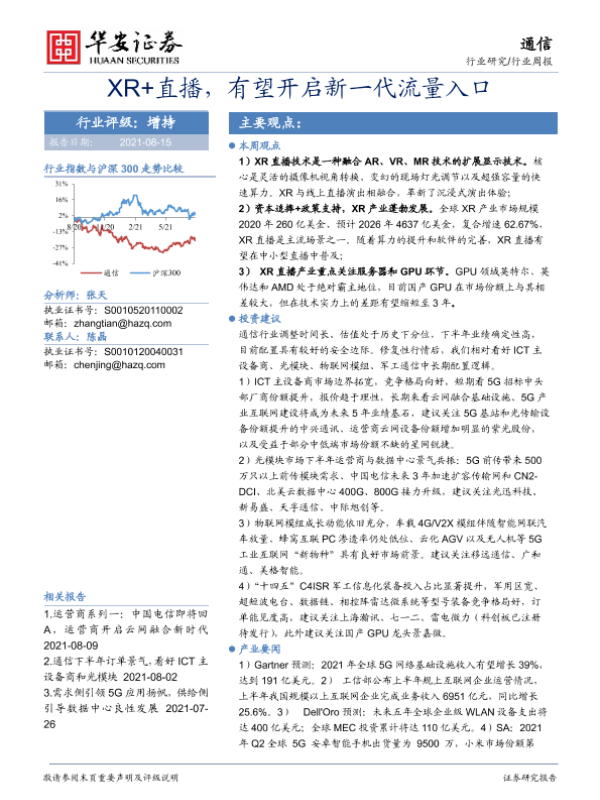 【华安证券】【20210815】20210815-华安证券-通信行业周报:XR+直播,有望开启新一代流量入口-17页 行业研究