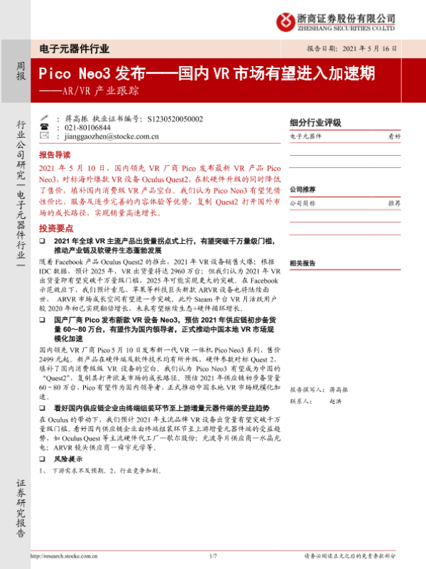 【浙商证券】【20210516】20210516-浙商证券-电子元器件行业:Pico Neo3发布——国内VR市场有望进入加速期──AR VR产业跟踪-7页 行业研究
