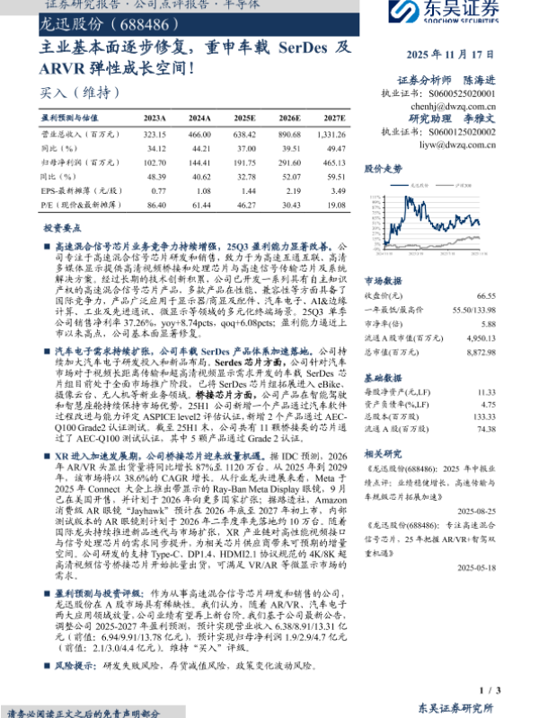 【东吴证券】【202511】主业基本面逐步修复,重申车载 SerDes及 ARVR弹性成长空间!-3页 证券期货研究报告
