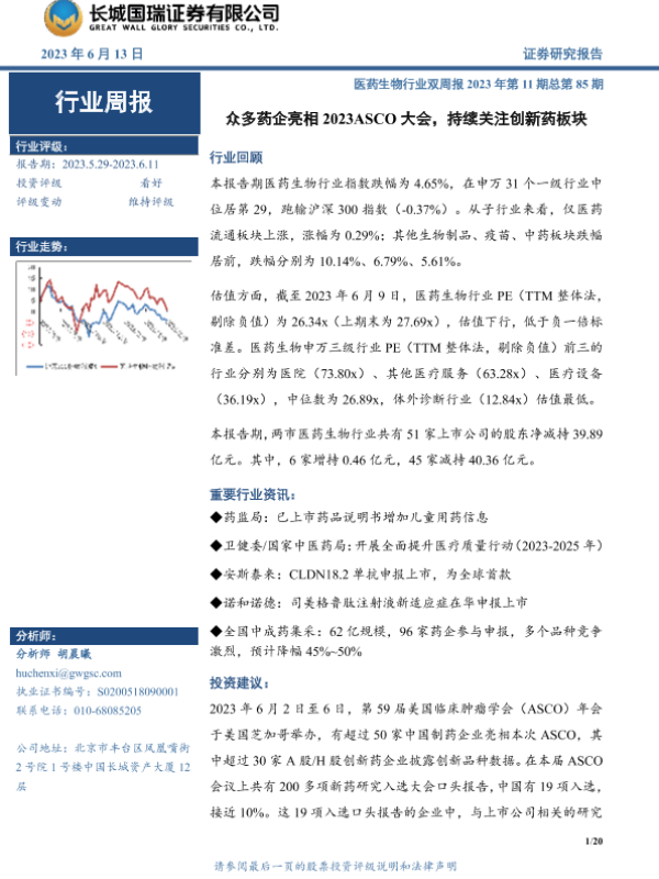 【长城国瑞证券】【20230613】医药生物行业双周报2023年第11期总第85期:众多药企亮相2023ASCO大会,持续关注创新药板块-20页 行业研究