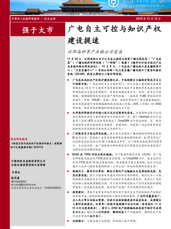 【中银证券】【20191212】广电自主可控与知识产权建设提速:汉邦高科等产业链公司受益-4页 行业研究