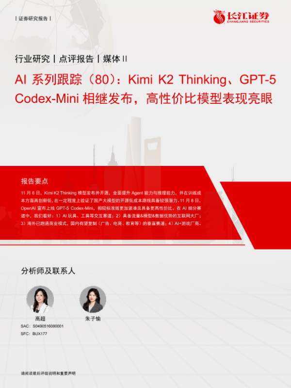 【长江证券】【202511】媒体行业AI系列跟踪(80):Kimi K2 Thinking、GPT-5 Codex-Mini相继发布,高性价比模型表现亮眼-5页 证券期货研究报告