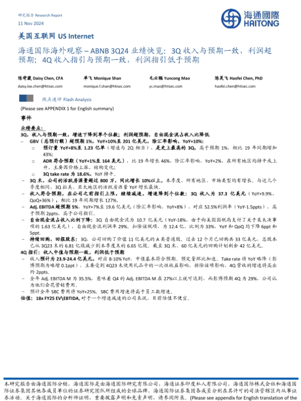 【海通国际】【20241111】海通国际海外观察 – ABNB 3Q24业绩快览:3Q收入与预期一致,利润超预期;4Q收入指引与预期一致,利润指引低于预期-11页 行业研究