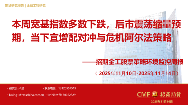 【招商期货】【202511】20251116-招商期货-金工股票策略环境监控周报_本周宽基指数多数下跌_后市震荡缩量预期_当下宜增配对冲与危机阿尔法策略-43页 证券期货研究报告