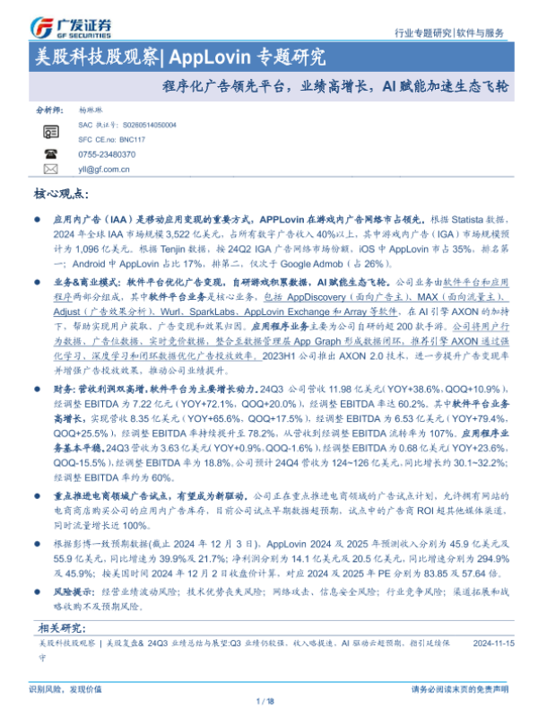 【广发证券】【20241209】软件与服务行业美股科技股观察|AppLovin专题研究:程序化广告领先平台,业绩高增长,AI赋能加速生态飞轮-18页 行业研究