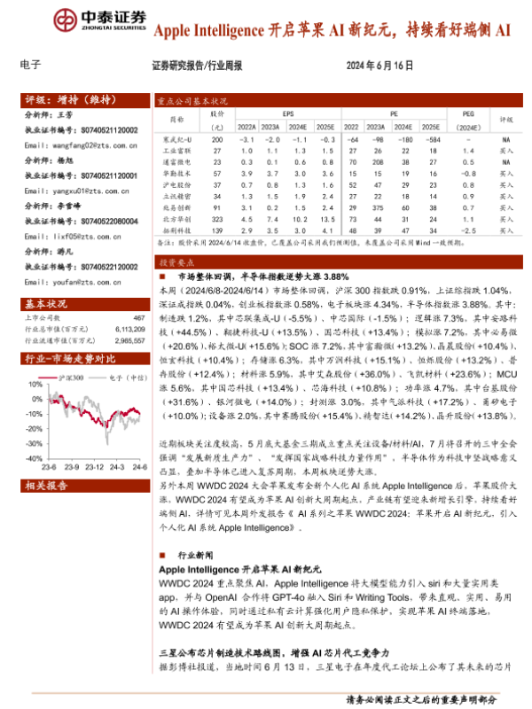 【中泰证券】【20240616】20240616-中泰证券-电子行业周报:Apple Intelligence开启苹果AI新纪元,持续看好端侧AI-17页 行业研究
