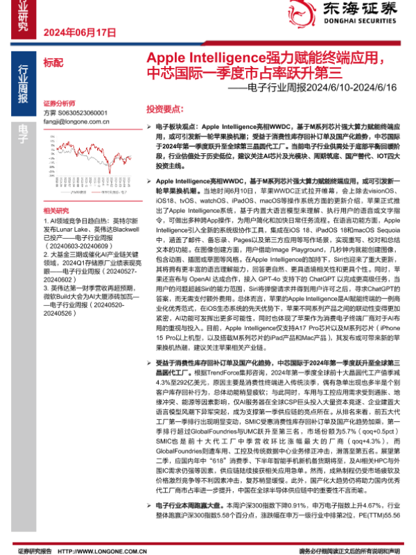 【东海证券】【20240617】20240617-东海证券-电子行业周报:Apple Intelligence强力赋能终端应用,中芯国际一季度市占率跃升第三-14页 行业研究