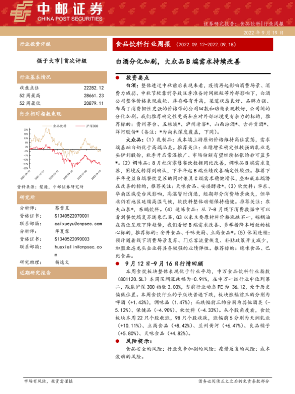 【中邮证券】【20220919】20220919-中邮证券-食品饮料行业周报:白酒分化加剧,大众品B端需求持续改善-17页 行业研究