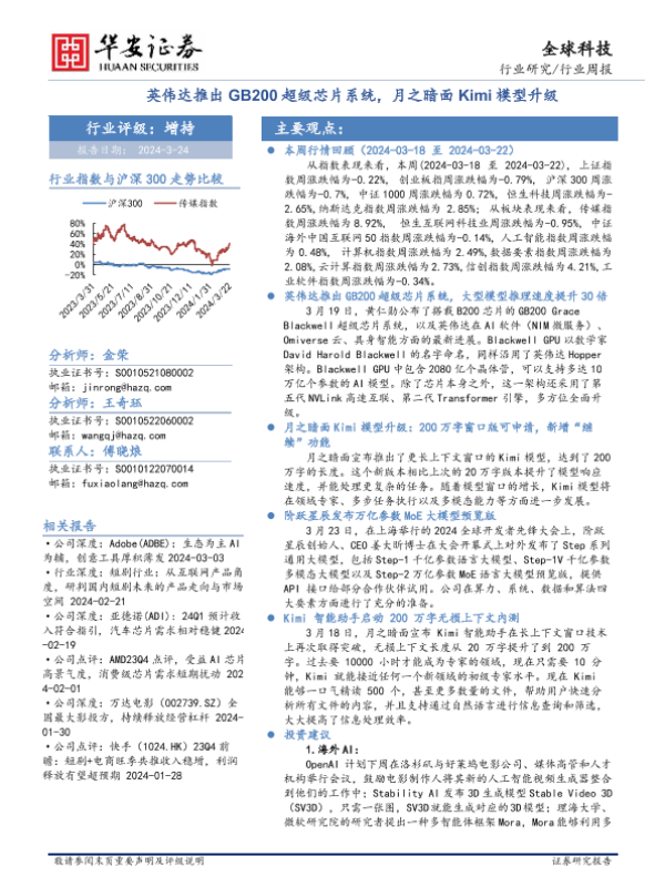 【华安证券】【20240324】全球科技行业周报:英伟达推出GB200超级芯片系统,月之暗面Kimi模型升级-24页 行业研究