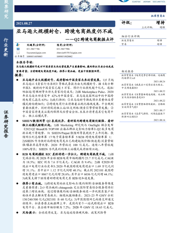 【国泰君安证券】【20210827】Q2跨境电商数据点评-亚马逊大规模封仓,跨境电商热度仍不减-4页 行业研究