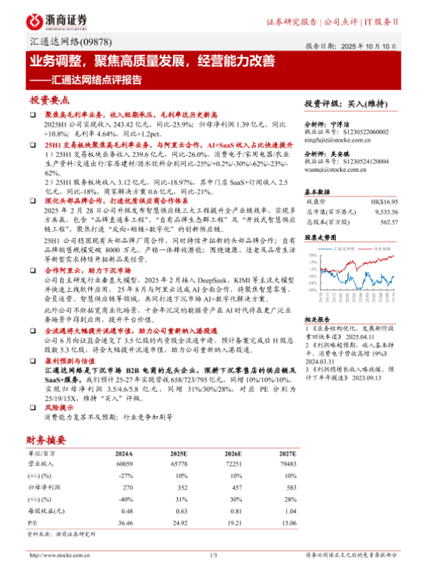 【浙商证券】【202510】业务调整,聚焦高质量发展,经营能力改善——汇通达网络点评报告-3页 证券期货研究报告