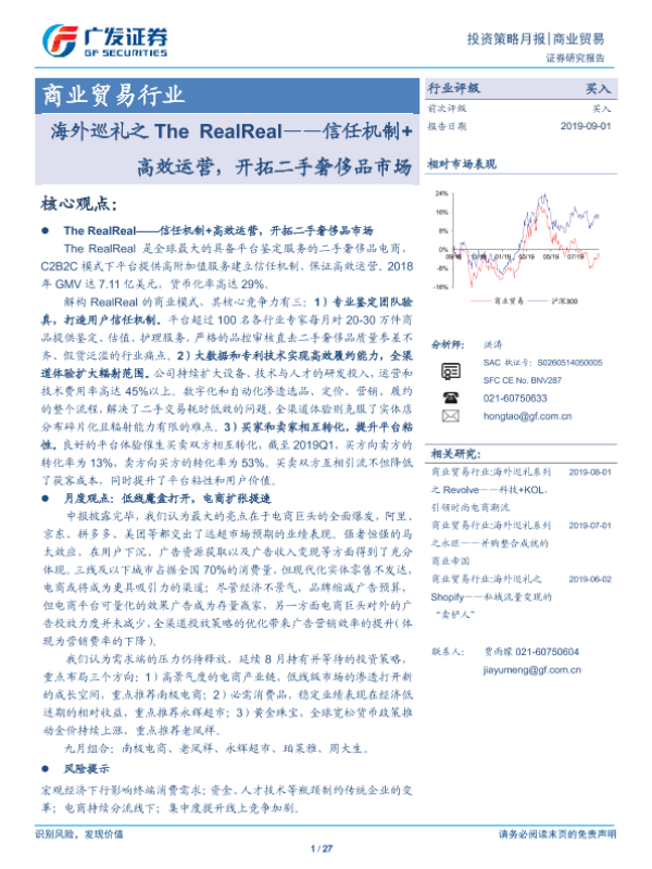【广发证券】【20190901】商业贸易行业:海外巡礼之TheRealReal~信任机制+高效运营,开拓二手奢侈品市场-28页 行业研究