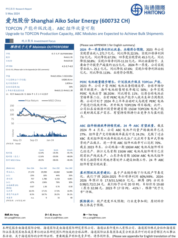 【海通国际】【20240505】爱旭股份(600732)TOPCON产能升级改造,ABC组件放量可期-12页 行业研究