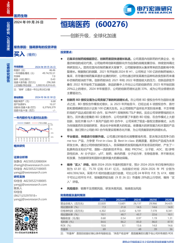 【申万宏源】【20240926】恒瑞医药(600276)创新升级,全球化加速-32页 行业研究