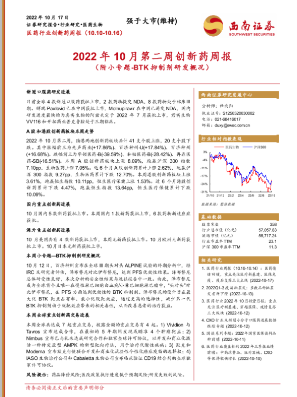 【西南证券】【20221017】2022年10月第二周创新药周报(附小专题-BTK抑制剂研发概况)-20页 行业研究