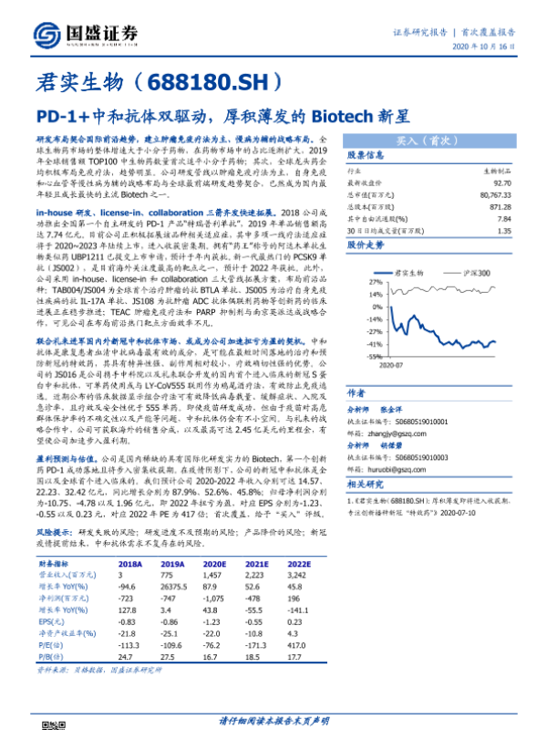 【国盛证券】【20201016】君实生物-PD-1+中和抗体双驱动,厚积薄发的Biotech新星-26页 行业研究
