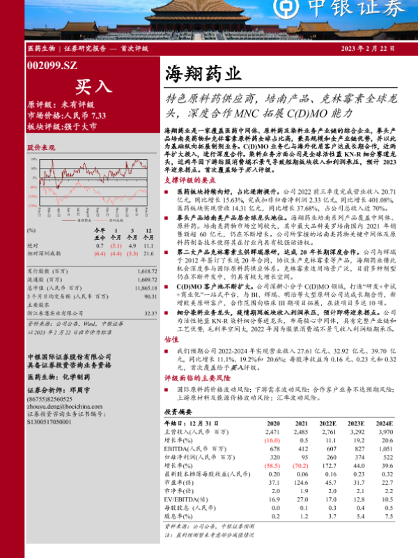【中银证券】【20230222】海翔药业-002099.SZ-特色原料药供应商,培南产品、克林霉素全球龙头,深度合作MNC拓展C(D)MO能力-28页 行业研究