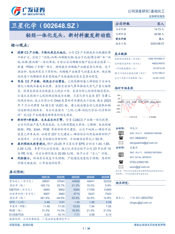 【广发证券】【20230827】卫星化学(002648.SZ):轻烃一体化龙头,新材料激发新动能-36页 行业研究