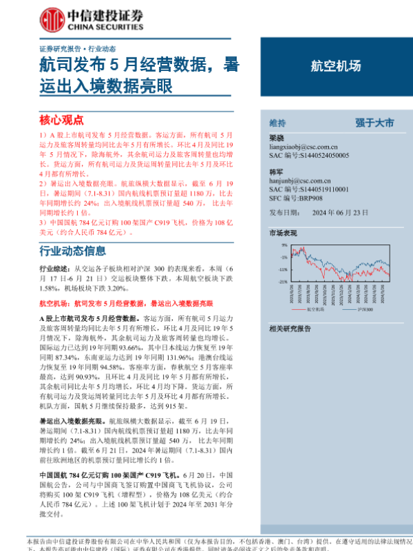 【中信建投证券】【20240623】航空机场行业动态:航司发布5月经营数据,暑运出入境数据亮眼-23页 行业研究