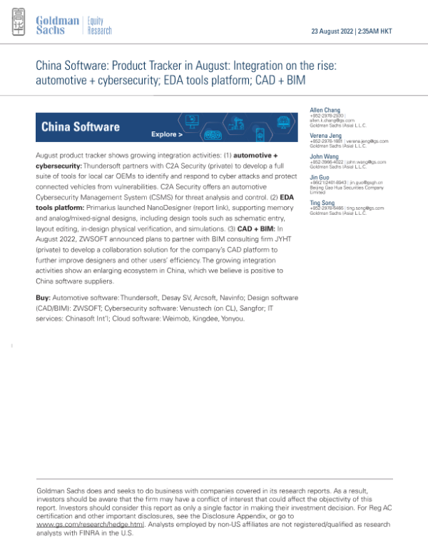 【Goldman Sachs】【20220823】中国软件:产品跟踪报告 - 集成趋势上升:汽车+网络安全;EDA工具平台;CAD+BIM-10页 行业研究