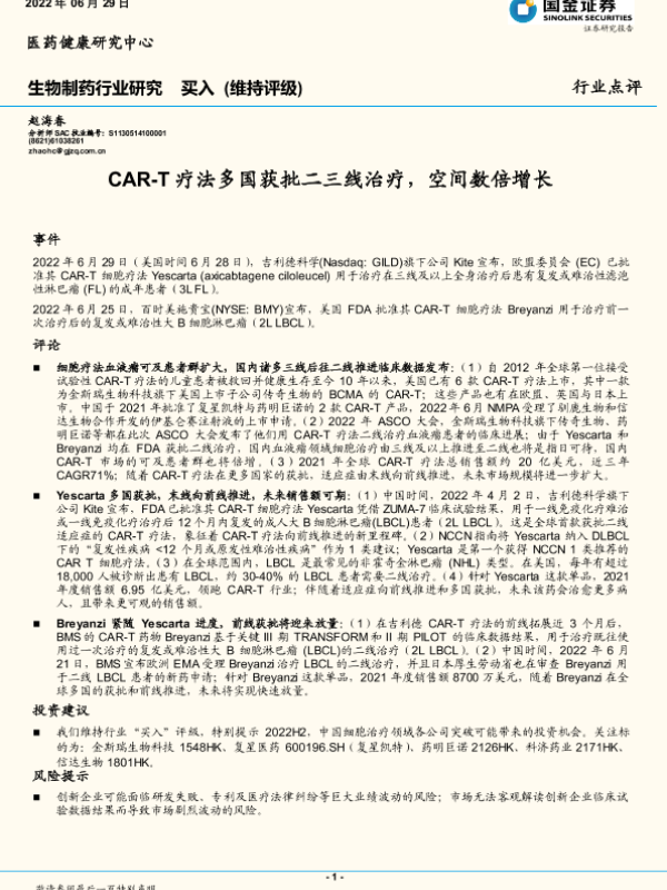 【国金证券】【20220629】CAR-T疗法多国获批二三线治疗,空间数倍增长-3页 行业研究
