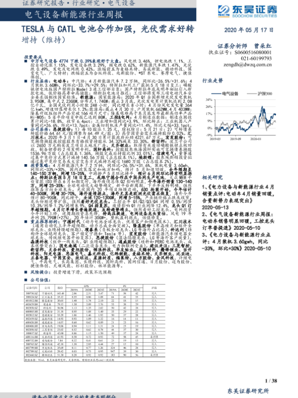 【东吴证券】【20200517】电气设备新能源行业周报:TESLA与CATL电池合作加强,光伏需求好转-38页 行业研究