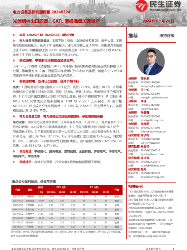 【民生证券】【20240324】电力设备及新能源周报:光伏组件出口回暖,CATL滑板底盘加速量产-23页 行业研究