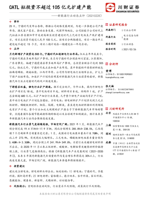 【川财证券】【20210226】CATL拟投资不超过105亿元扩建产能-2页 行业研究