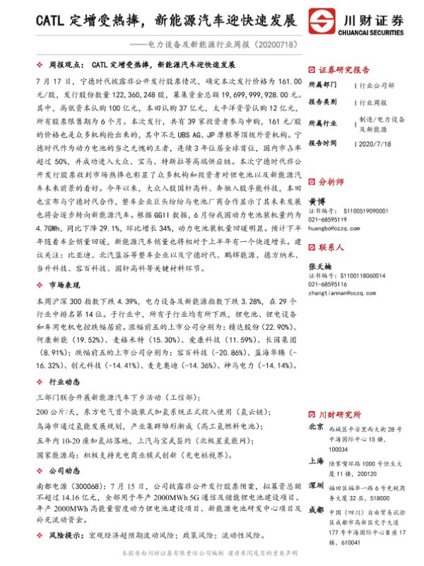 【川财证券】【20200718】电力设备及新能源行业周报:CATL定增受热捧,新能源汽车迎快速发展-17页 行业研究