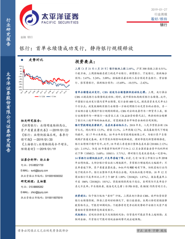 【太平洋证券】【20190127】银行行业周报:首单永续债成功发行,静待银行规模释放-21页 行业研究