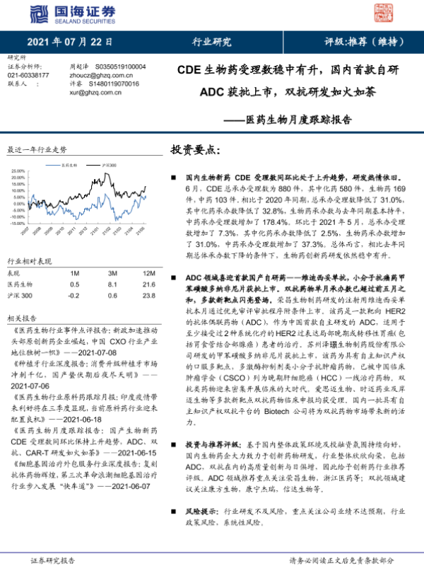 【国海证券】【20210722】医药生物行业月度跟踪报告:CDE生物药受理数稳中有升,国内首款自研ADC获批上市,双抗研发如火如荼-20页 行业研究