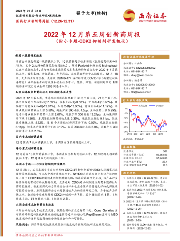 【西南证券】【20230102】医药行业创新药周报:2022年12月第五周创新药周报(附小专题~CDK2抑制剂研发概况-20页 行业研究