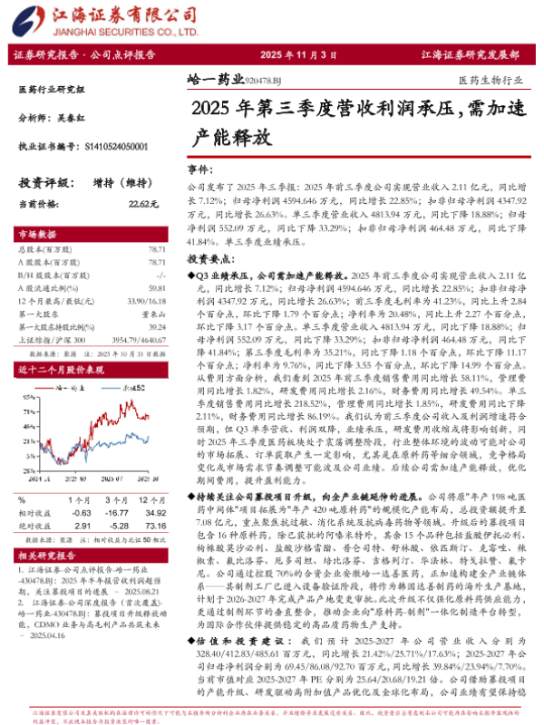【江海证券】【202511】2025年第三季度营收利润承压_需加速产能释放-5页 证券期货研究报告